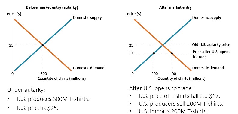 - when the U.S. moves from autarky to free trade, the world demand curve shifts to the right because U.S. consumers have entered the market