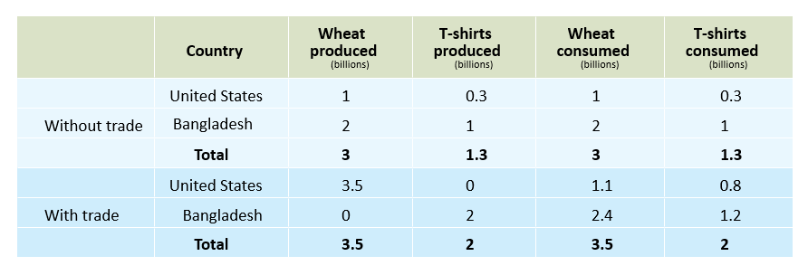 U.S. and Bangladeshi produce wheat and T-shirts.