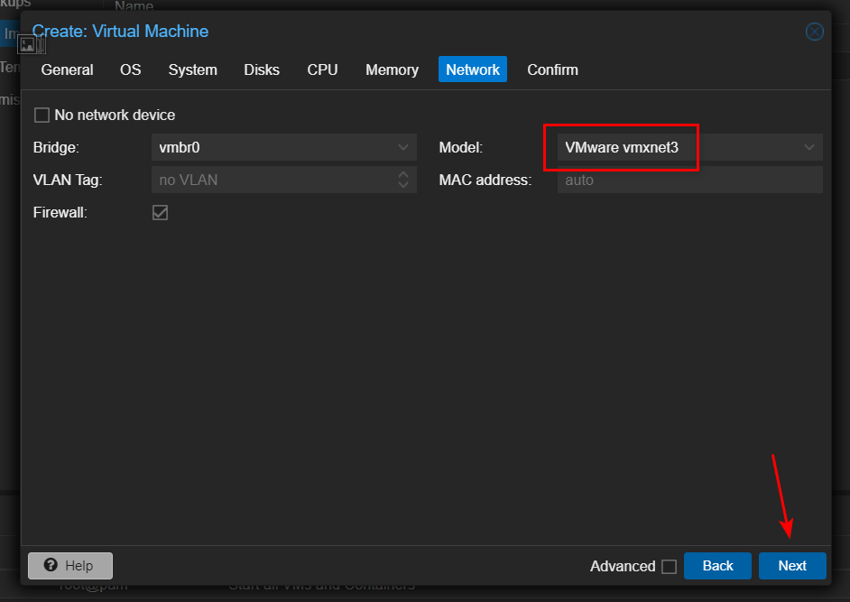 - 在 Model 一栏选择 VMWare vmxnet3