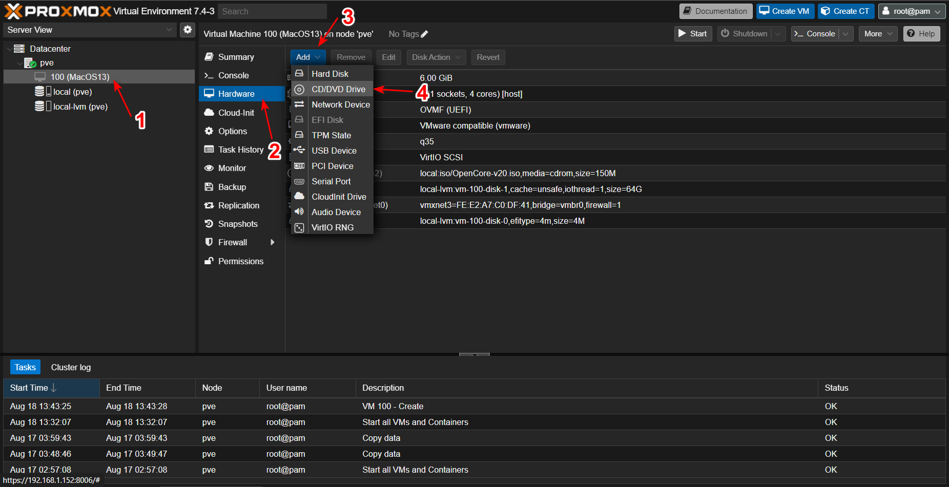 这时能在左侧看到我们的 Mac 虚拟机,点击后选择 Hardware > Add > CD/DVD Drive。