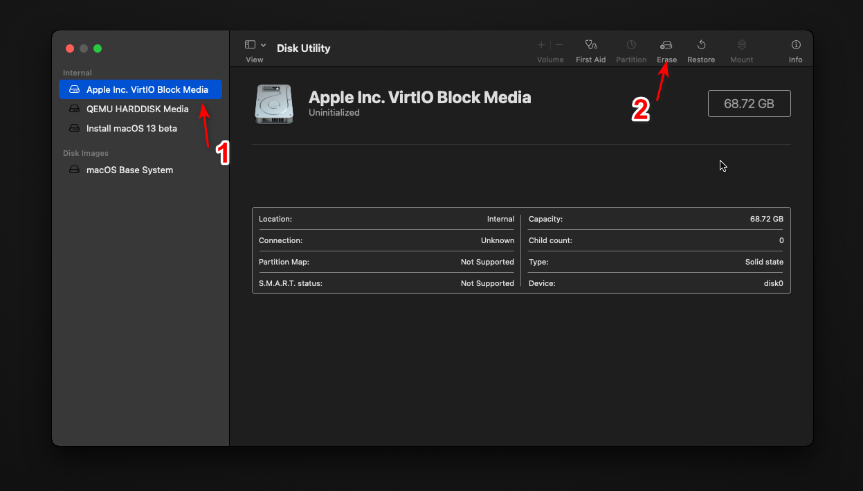 点击 Disk Utility,找到 VirtIO Block 硬盘并点击 Erase。